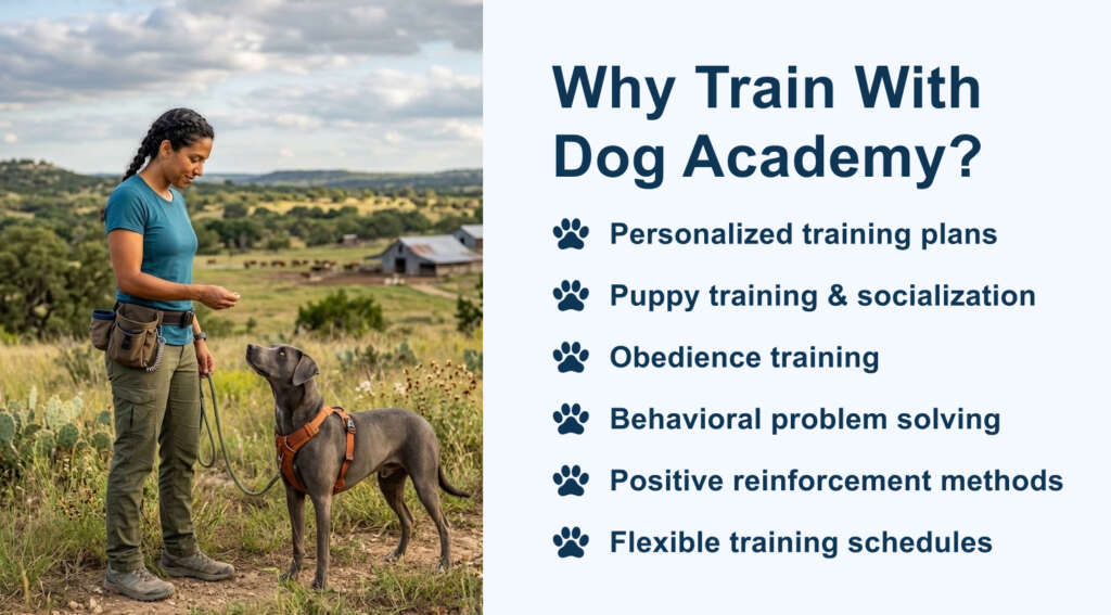 Dog Academy stands out as the best dog trainer in Beaumont by combining expert-led instruction with flexible training formats and science-backed techniques. Our trainers understand the local environment and tailor training to Beaumont’s climate, neighborhoods, and daily routines. Whether training at home or in public spaces, Dog Academy focuses on building trust, reliability, and confidence in every dog-owner relationship.
