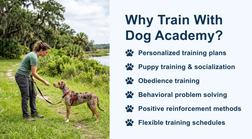 Dog Academy combines local trainers who understand Rock Hill’s environment with structured methods designed by AKC-certified professionals. You’ll receive guidance that fits your dog’s personality and the places you visit most. This balance helps you practice skills at home, around your neighborhood, or in public areas across York County, like Catawba River and Old Town.